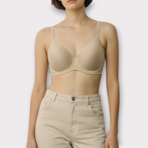 Model jest wykonany z miękkiego i przyjemnego w dotyku materiału, który świetnie dopasowuje się do sylwetki, nie powodując dyskomfortu. Klasyczny beżowy kolor sprawia, że biustonosz pozostaje niewidoczny nawet pod jasnymi ubraniami — idealny na co dzień, do pracy i pod stylizacje z cienkich tkanin.