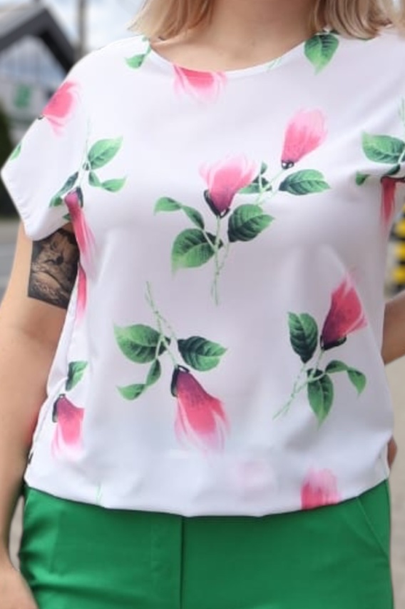 Bluzka damska w kwiaty na białym tle – wygodny fason z krótkim rękawem
