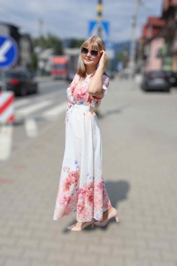 Długa sukienka z kopertowym dekoltem to idealna propozycja dla kobiet ceniących wygodę i elegancję. Model ten wyróżnia się niezwykłym krojem, który podkreśla atuty sylwetki każdej kobiety. Krótkie rękawy dodają lekkości całości, a delikatny motyw kwiatowy nadaje sukience subtelnego uroku. Pas gumkowany oraz wiązany pasek sprawiają, że dopasowanie sukienki do figury jest bardzo proste.
