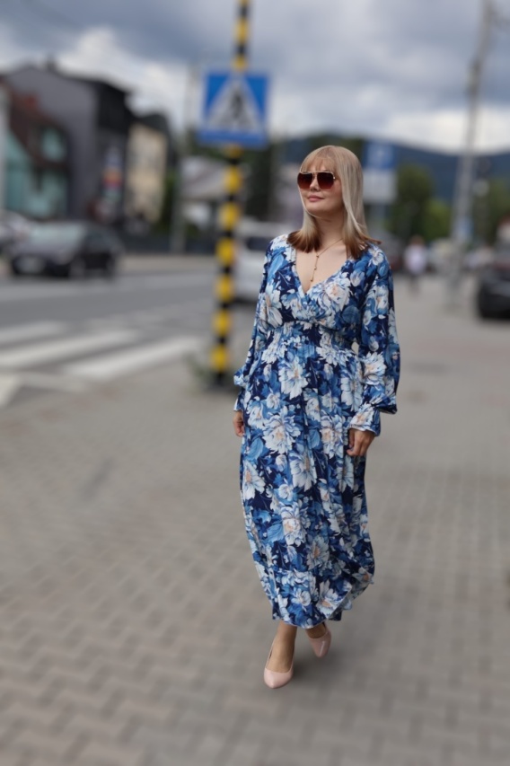 Długa sukienka z długim rękawem to propozycja, która łączy w sobie kobiecy wdzięk z komfortem noszenia w cieplejsze dni. Niebieskie tło sukienki podkreśla delikatny, kwiatowy wzór, który dodaje stylizacji świeżości i naturalnej elegancji.