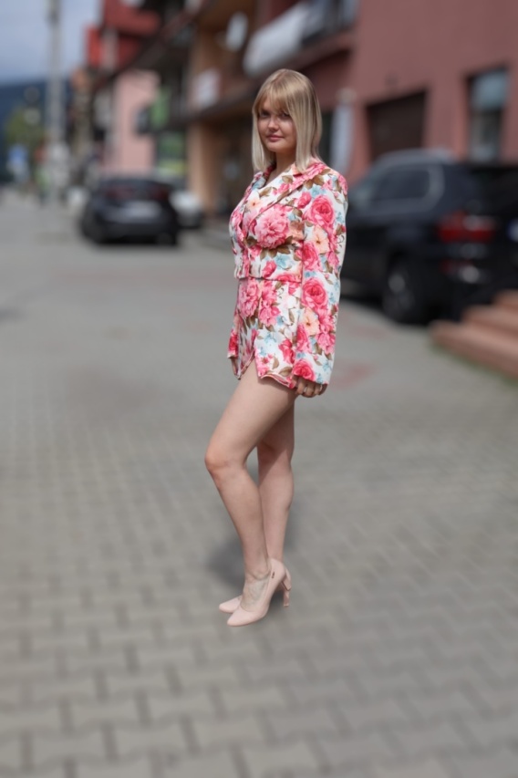 Ten komplet w kwiatowy print to idealna propozycja dla miłośniczek romantycznych, ale wyrazistych stylizacji. Dopasowany żakiet o klasycznym kroju pięknie podkreśla talię, a krótkie spodenki eksponują nogi i zapewniają swobodę. Intensywny motyw róż w połączeniu z pastelowym tłem sprawia, że całość wygląda lekko, świeżo i bardzo modnie. Idealny wybór na wiosnę i lato 2025!