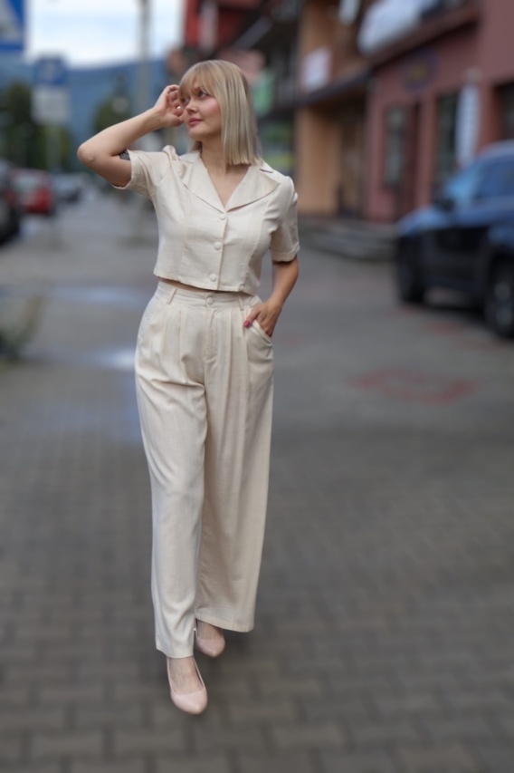 Lniano wiskozowy komplet szerokie spodnie i krótka bluzka, beżowy