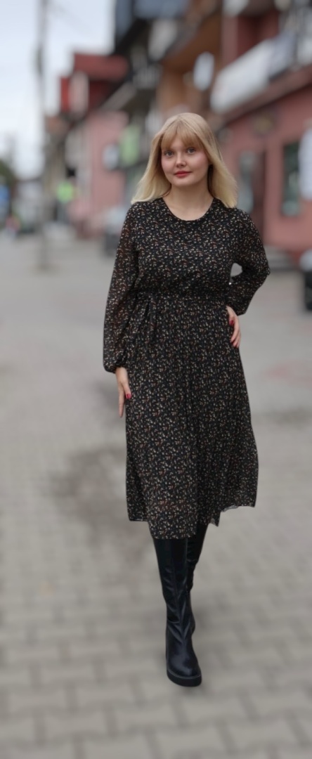Drobny, kwiatowy wzór na czarnym tle to ponadczasowy motyw, który dodaje sukience delikatności i romantycznego charakteru. To świetny wybór zarówno na co dzień, jak i na wyjątkowe okazje, gdy chcesz wyglądać kobieco i stylowo.
