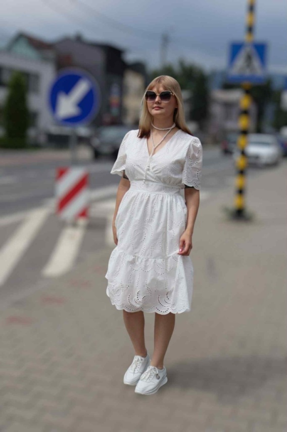 Ażurowy haft stanowi wyjątkowy detal, który przyciąga wzrok i nadaje sukience niepowtarzalnego charakteru. Kopertowy dekolt, doskonale podkreśla walory biustu i optycznie wysmukla szyję i sylwetkę. Krótkie rękawy sprawiają, że sukienka jest wygodna w cieplejsze dni, a także daje możliwość noszenia jej z marynarką lub ramoneską w chłodniejsze. Z tyłu sukienki jest gumka co zapewnia idealne dopasowanie sukienki do figury, podkreślając talię i dodając sukience kobiecego charakteru. Sukienka posiada halkę, która zapobiega prześwitaniu materiału, zapewniając komfort podczas noszenia.