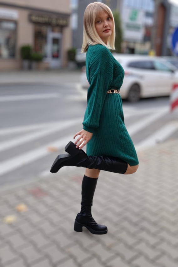Ta wyjątkowa sukienka sweterkowa w głębokim zielonym kolorze łączy kobiecość z wygodą, tworząc styl idealny na co dzień i specjalne okazje. Miękka, przyjemna w dotyku dzianina otula sylwetkę, zapewniając komfort noszenia i jednocześnie pięknie podkreślając figurę.
