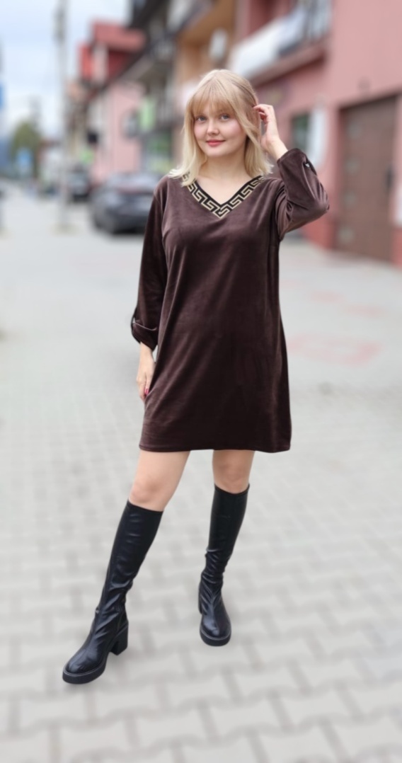 Ta welurowa sukienka w odcieniu głębokiego brązu to połączenie klasyki i wygody w nowoczesnym wydaniu. Dekolt w kształcie litery V ozdobiony geometrycznym wzorem przyciąga wzrok, a miękki welur pięknie układa się na sylwetce. Sukienka idealna na spotkania, eleganckie wyjścia czy rodzinne uroczystości.