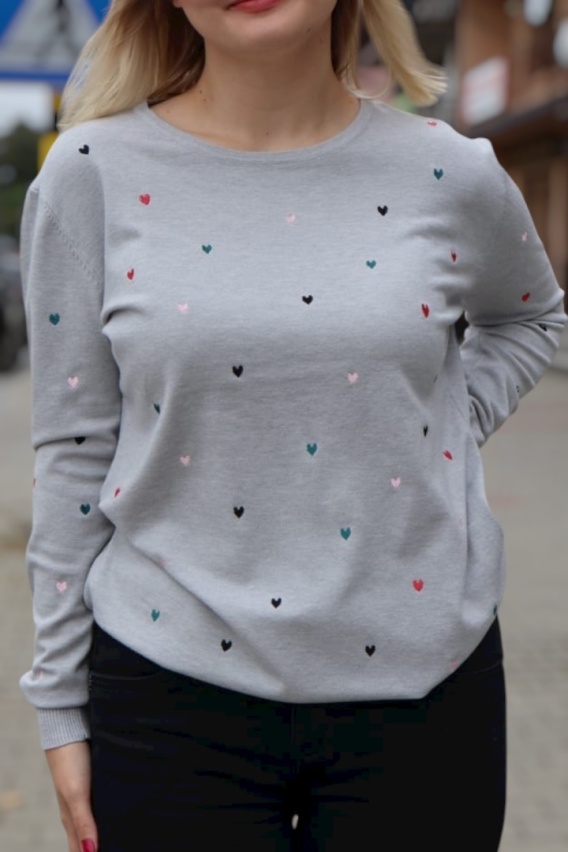 Sweter ma prosty, klasyczny fason z okrągłym dekoltem i długim rękawem, dzięki czemu pasuje do wielu stylizacji – zarówno codziennych, jak i bardziej eleganckich. Możesz nosić go do jeansów, spódnic czy eleganckich spodni. Szary kolor w połączeniu z kolorowymi serduszkami sprawia, że model prezentuje się świeżo, radośnie i ponadczasowo.