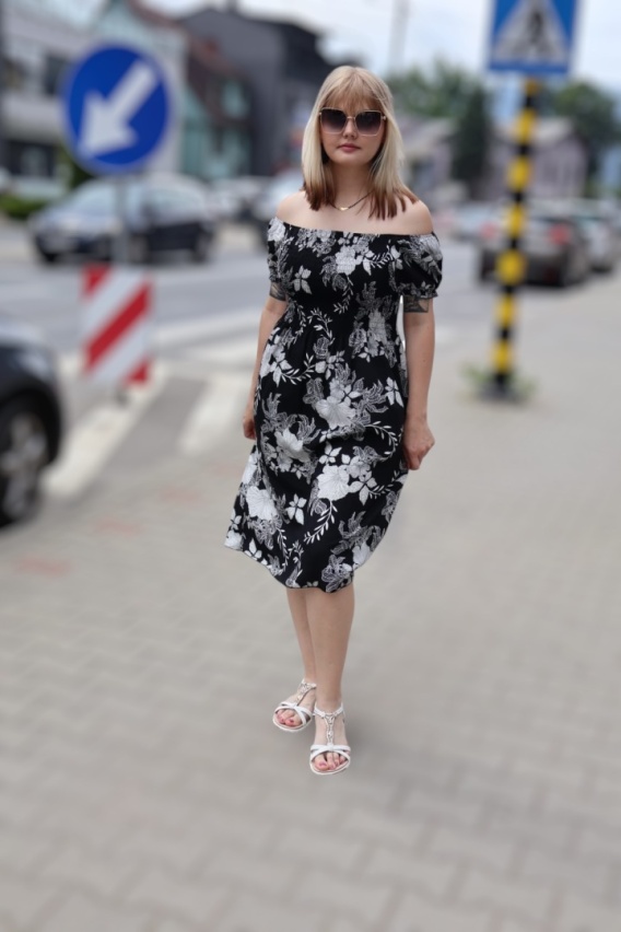 Ta urocza sukienka z krótkimi rękawami to idealne połączenie wygody i stylu na lato. Lekka, zwiewna tkanina doskonale sprawdzi się w upalne dni, a elegancki, kwiatowy wzór nadaje całości romantycznego charakteru. Dzięki fasonowi hiszpanka z odkrytymi ramionami sukienka pięknie podkreśla dekolt i dodaje lekkości całej stylizacji.