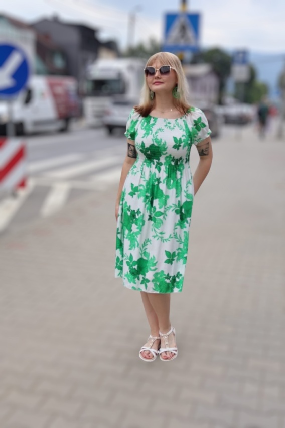 Długość za kolano sprawia, że sukienka świetnie sprawdzi się zarówno na co dzień, jak i na bardziej wyjątkowe okazje – spacer po mieście, kawę z przyjaciółką czy wieczorne wyjście.